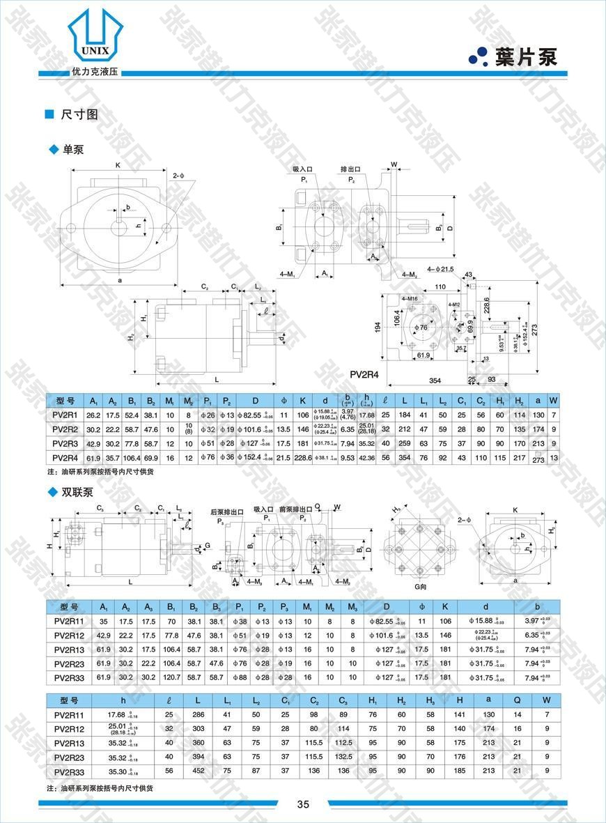 該系列的雙聯(lián)泵是由同一軸驅動的兩個PV2R系列單泵并聯(lián)組裝在同一殼體內而成,具有一個共用進油口和兩個可以輸向兩個獨立回路的出油口。按照兩個泵的系列組合,可獲得多種流量。